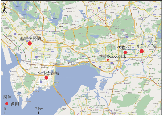 调查地点选择在深圳市具有代表性的5处大型购物中心商业圈:东门步行街、华强北商业圈、福田星河Cocopark、海雅缤纷城、宝能太古城。其位置如图2所示。