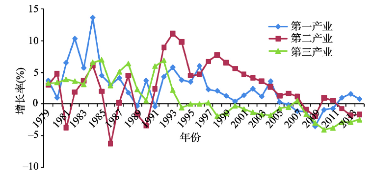 Fig. 1. The TFP growth rate changes of three industries in China in 1978-2014 |