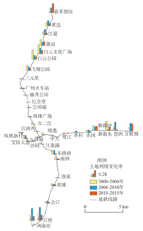图5. 广州地铁二号线、八号线站点各时间段土地利用变化率 |