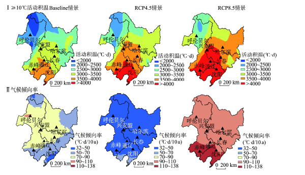 图8. 东北地区80%保证率生长季内≥ 10 ℃活动积温(Ⅰ)和气候倾向率(Ⅱ)分布 |