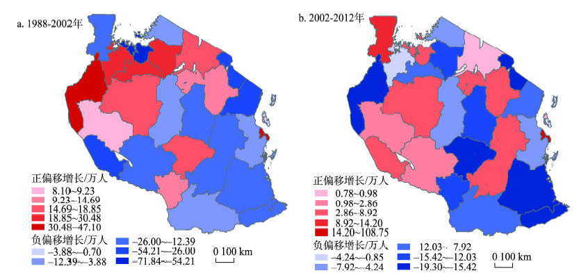 图3 1988-2012年坦桑尼亚各省人口偏移增长情况 |