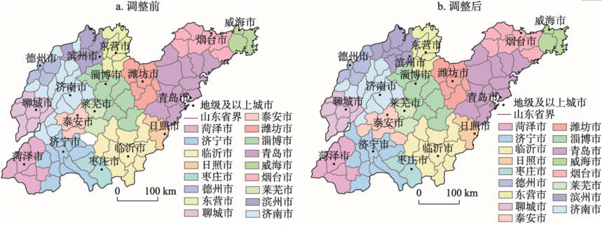| Fig.1 Identification of urban hinterland of cities at the prefecture level and above in Shandong Province |