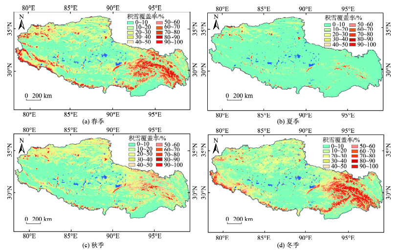 | 图3 2000-2014年西藏高原不同季节平均积雪覆盖率空间分布 |