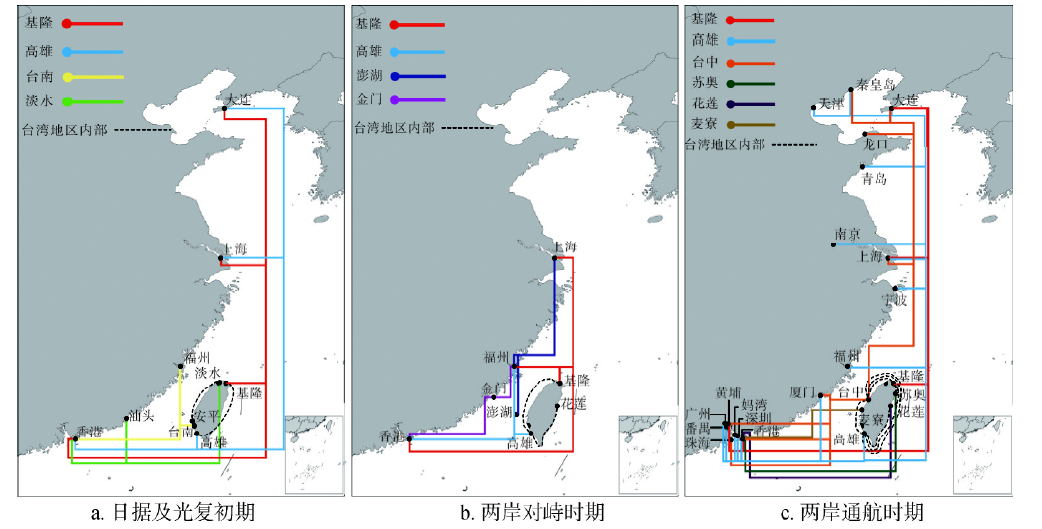 注:图b两岸对峙时期主要反映的是1951年前的港口功能情况,在此之后两岸处于海运网络中断。