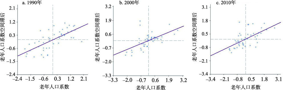 | Fig.4 Moran scatter plot for the coefficient of aging population in Jilin Province, 1990, 2000, and 2010 |