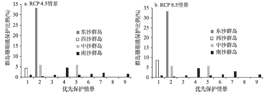图6 RCP 4.5和RCP 8.5情景下南海诸岛优先保护珊瑚礁数占各群岛珊瑚礁总数的比例 |