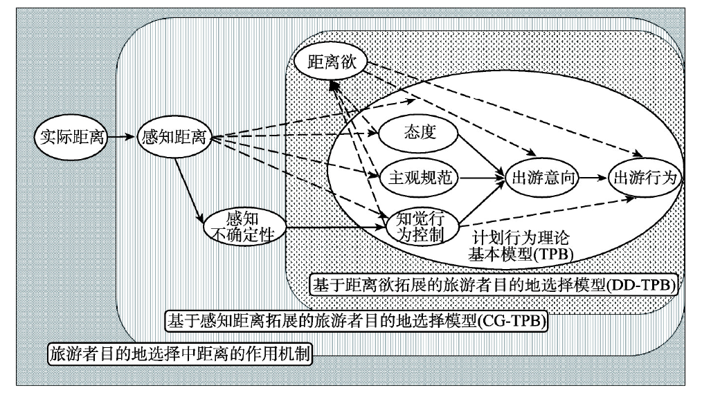 图8 距离对旅游者目的地选择影响的微观解释框架 注:虚线箭头为待验证的理论假设 |