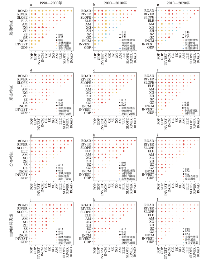 | 图6 1990—2020年粤港澳大湾区城镇用规模特征、形态特征、分布特征和空间格局类型变化驱动力交互作用 注:变量符号见 |