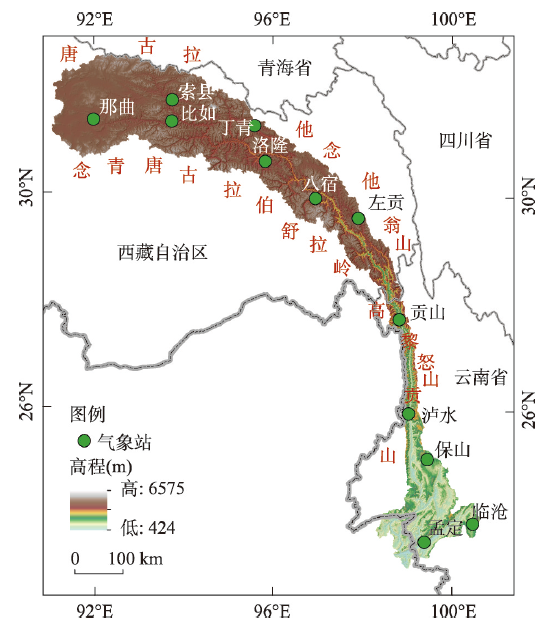 | 图1 怒江流域区位及气象站点分布 注:基于自然资源部标准地图服务网站GS(2020)4619号标准地图制作,底图边界无修改。 |