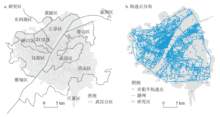 | 图1 研究区概况与武汉市三环内出租车轨迹点分布 |