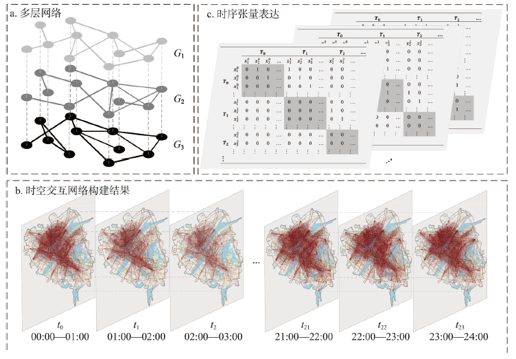 | 图2 多层网络、时序张量表达示意图与时空交互网络构建结果 |
