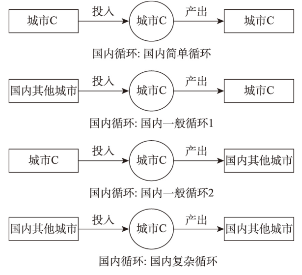 城市国内循环的形成总共有4种路径。本文以城市C为例展示国内循环的4种路径(图1 )。因为是国内循环,城市C的投入来源地和产出吸收地都需要来自于国内地区。具体而言,第1种路径是城市C使用自身的投入制造产品,并且最终产品被自身消费。此时,城市C的产出使用自身的增加值,并且最终被自身吸收,将其定义为城市国内简单循环。第2种路径是城市C使用国内其他城市的投入制造产品,并且最终产品被自身消费。此时,城市C的产出使用国内其他城市的增加值,并且最终被自身吸收,将其定义为城市国内一般循环1。第3种路径是城市C使用自身的投入制造产品,并且最终产品被国内其他城市消费。此时,城市C的产出使用自身的增加值,并且最终被国内其他城市吸收,将其定义为城市国内一般循环2。第4种路径是城市C使用国内其他城市的投入制造产品,并且最终产品被国内其他城市消费。此时,城市C的产出使用国内其他城市增加值,并且最终被国内其他城市吸收,将其定义为城市国内复杂循环。