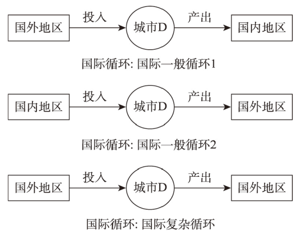 城市国际循环的形成总共有3种路径(图2 )。本文以城市D为例展示国际循环的3种路径。由于是国际循环,城市D的投入来源地和产出吸收地至少需要有一方来自于国外地区。具体而言,第1种路径是城市D使用国外地区的投入制造产品,并且最终产品被国内地区消费。此时,城市D的产出使用国外地区的增加值,并且最终被国内地区吸收。本文将其定义为城市国际一般循环1。第2种路径是城市D使用国内地区的投入制造产品,并且最终产品被国外地区消费。此时,城市D的产出使用国内地区的增加值,并且最终被国外地区吸收。本文将其定义为城市国际一般循环2。第3种路径是城市D使用国外地区的投入制造产品,并且最终产品被国外地区消费。此时,城市D的产出使用国外地区增加值,并且最终被国外地区吸收。本文将其定义为城市国际复杂循环。不难发现,城市国际循环的第1种路径和第2种路径属于一般贸易,第3种路径则属于垂直专业化。