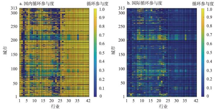 (2)行业层面国内国际循环。式(19)是基于式(17)的城市—行业层面国内循环参与度按城市层面加总到行业而得;式(20)为对应的行业层面国际循环参与度。