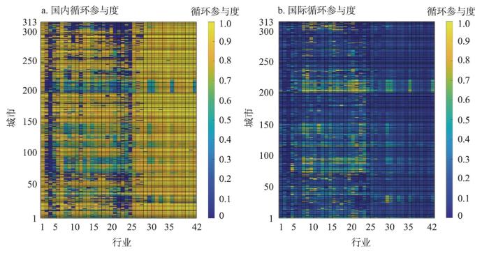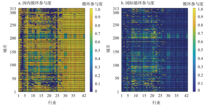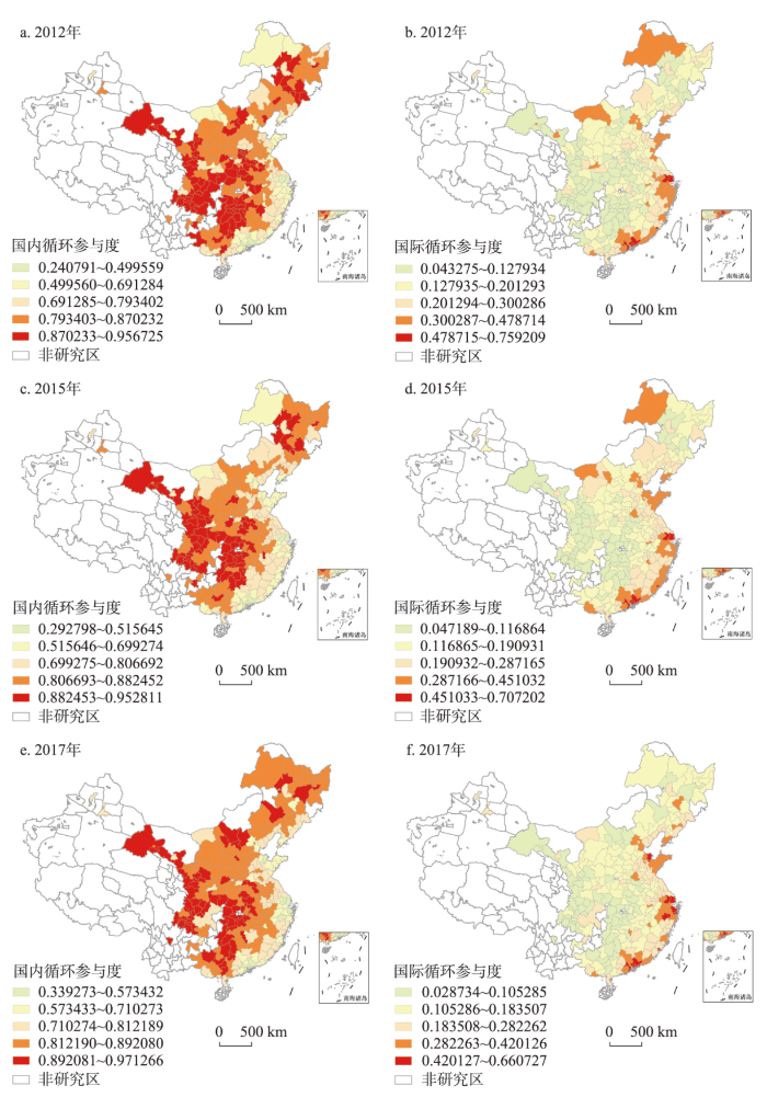 在国内循环方面,2012年城市—行业层面国内循环参与度≥ 50%的单元个数为10444个,占总体个数( 此处总体个数为样本总量减去国内循环参与度或国际循环参与度为0的样本个数。)比例为80.79%,中国城市—行业层面在2012年已经形成了国内循环为主体的态势。2015年城市—行业层面国内循环参与度≥ 50%的单元个数为10544个,占总体个数比例为92.2%,中国城市—行业层面国内循环为主体的单元个数比例在2012年后不断增强,这与中国共产党“十八大”报告强调经济发展更多依靠内需,特别是消费需求拉动密切相关。2017年城市—行业层面国内循环参与度≥ 50%的单元个数为10599个,占总体个数比例为83.19%,中国城市—行业层面国内循环为主体的单元个数比例稍有下降。