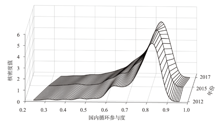 本文使用非参数核密度估计对中国城市2012年、2015年和2017年的国内循环参与度和国际循环参与度进行时序发展研究,具体核函数形式为高斯核函数(图6 、图7 )。